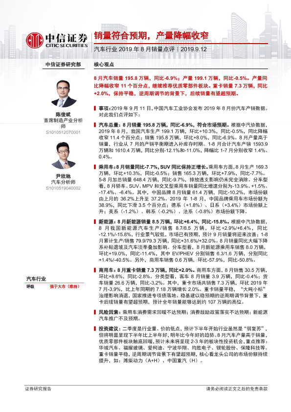 【中信证券】【20190912】汽车行业2019年8月销量点评:销量符合预期,产量降幅收窄-2页