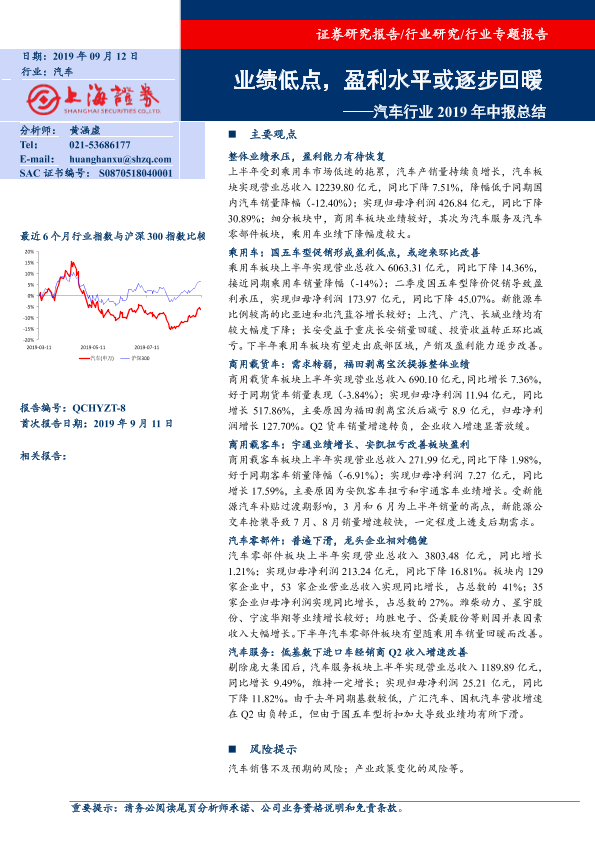 【上海证券】【20190912】汽车行业2019年中报总结:业绩低点,盈利水平或逐步回暖-17页