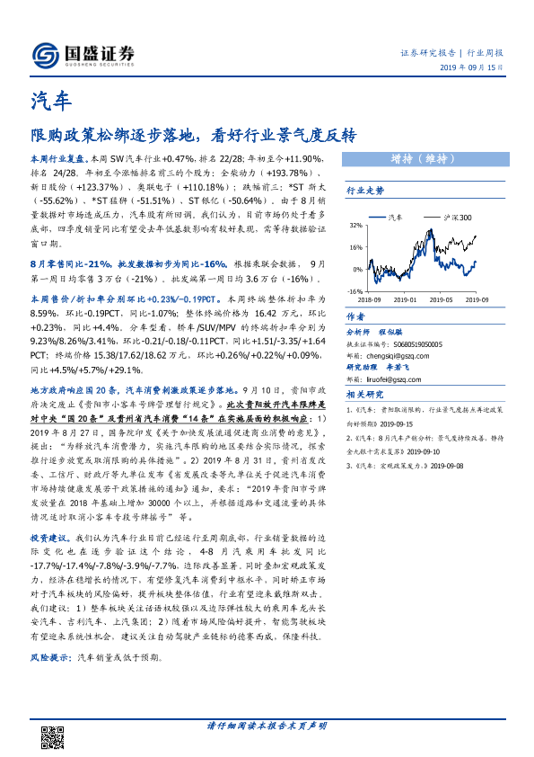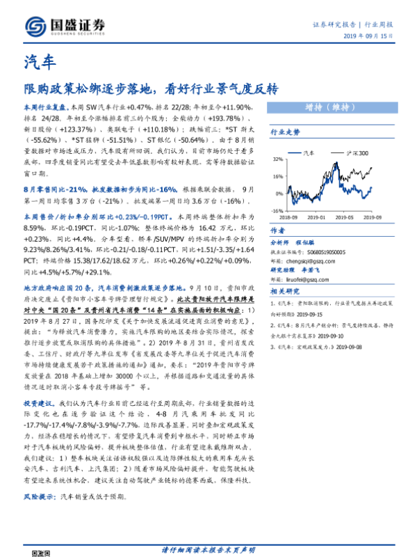 【国盛证券】【20190915】20190915-国盛证券-汽车行业周报:限购政策松绑逐步落地,看好行业景气度反转-14页
