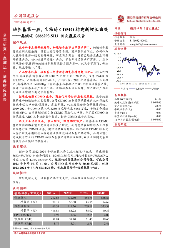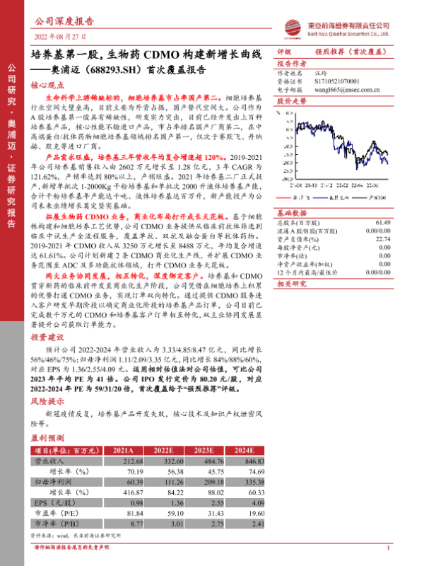 【东亚前海证券】【20220827】20220827-东亚前海证券-奥浦迈-688293.SH-首次覆盖报告:培养基第一股,生物药CDMO构建新增长曲线-40页