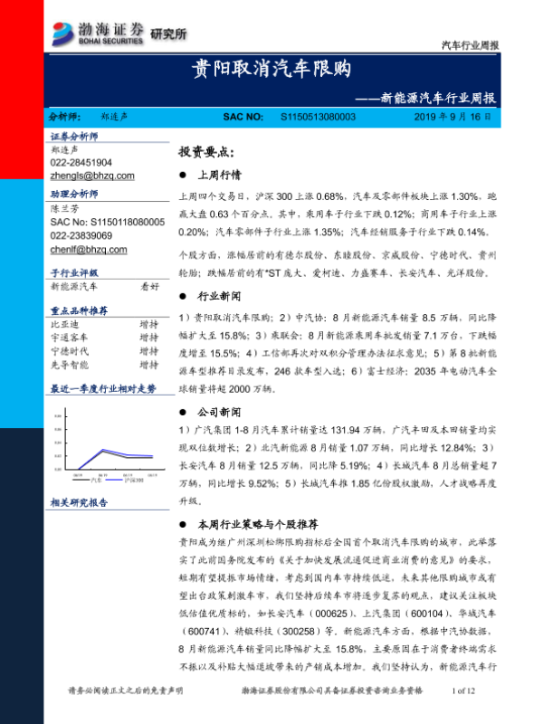 【渤海证券】【20190916】新能源汽车行业周报:贵阳取消汽车限购-12页