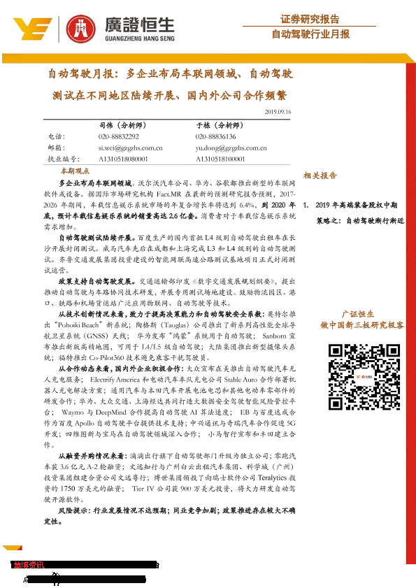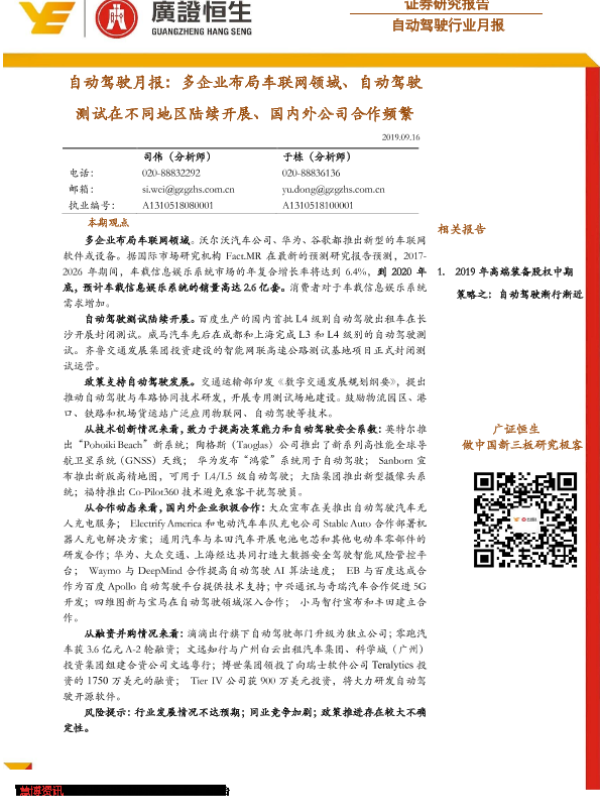【广证恒生】【20190916】20190916-广证恒生证券研究所-自动驾驶月报:多企业布局车联网领域、自动驾驶测试在不同地区陆续开展、国内外公司合作频繁-10页