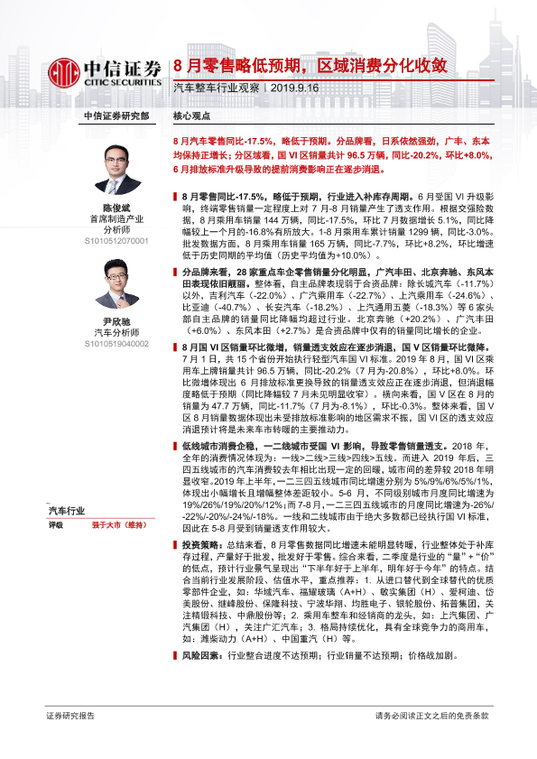 【中信证券】【20190916】汽车整车行业观察:8月零售略低预期,区域消费分化收敛-9页
