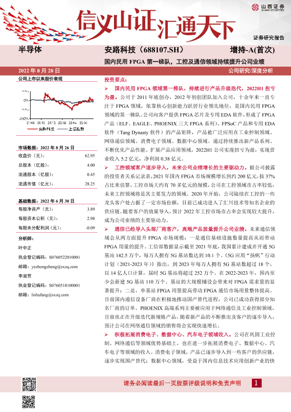 【山西证券】【20220828】国内民用FPGA第一梯队,工控及通信领域持续提升公司业绩-20页