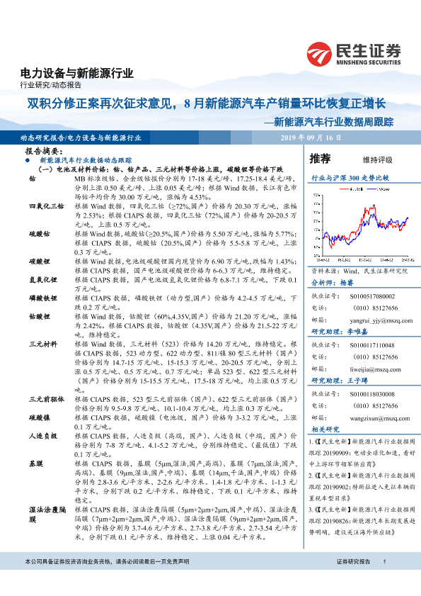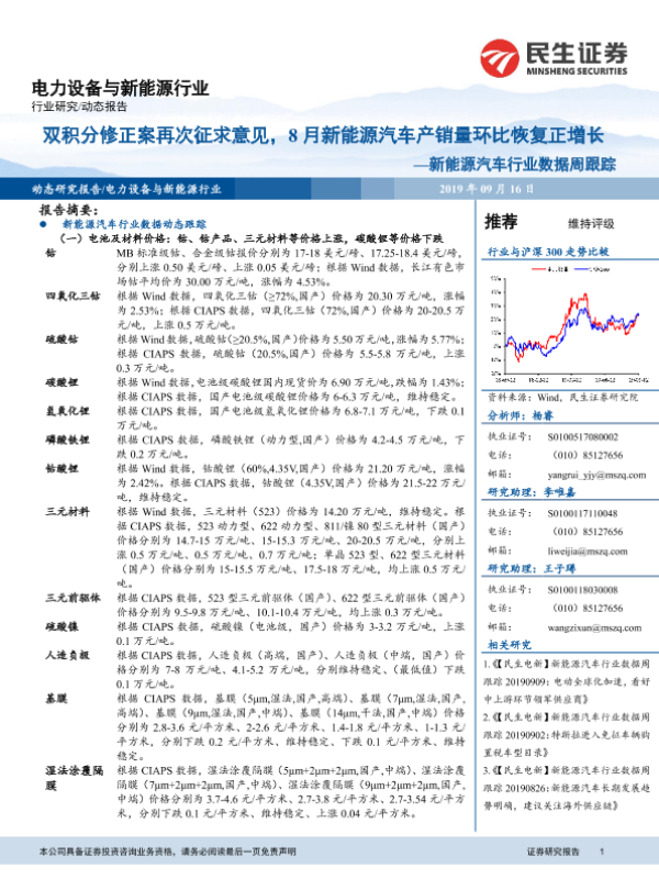 【民生证券】【20190916】20190916-民生证券-新能源汽车行业数据周跟:双积分修正案再次征求意见,8月新能源汽车产销量环比恢复正增-16页