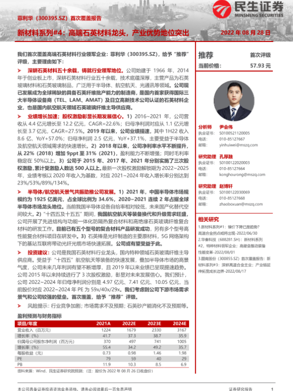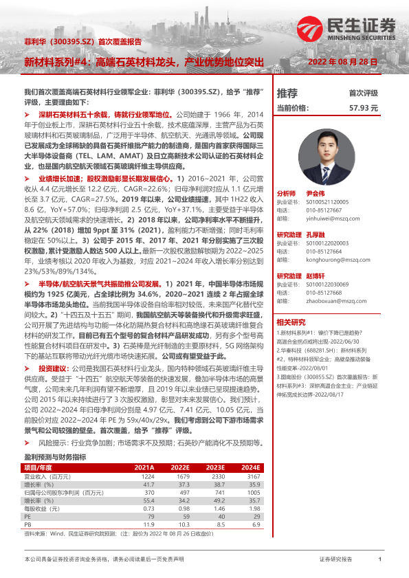 【民生证券】【20220828】20220828-民生证券-菲利华-300395.SZ-首次覆盖报告:新材料系列#4:高端石英材料龙头,产业优势地位突出-27页