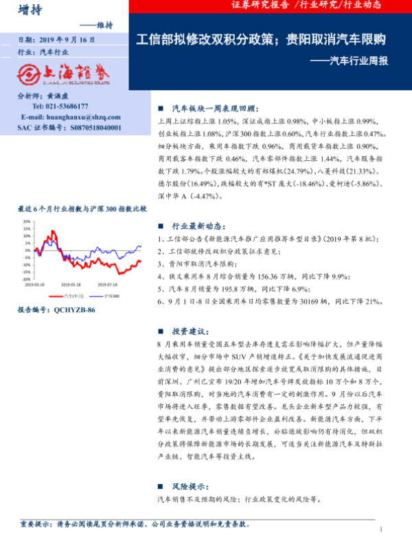 【上海证券】【20190916】20190916-上海证券-汽车行业周报:工信部拟修改双积分政策;贵阳取消汽车限购-8页