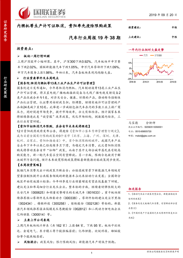 【国联证券】【20190920】20190920-国联证券-汽车行业周报19年38期:内燃机等生产许可证取消,贵阳率先废除限购政策-17页