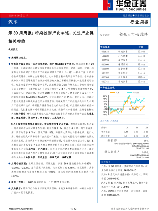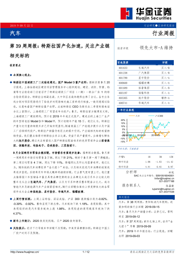 【华金证券】【20190922】20190922-华金证券-汽车第39周周报:特斯拉国产化加速,关注产业链相关标的-12页
