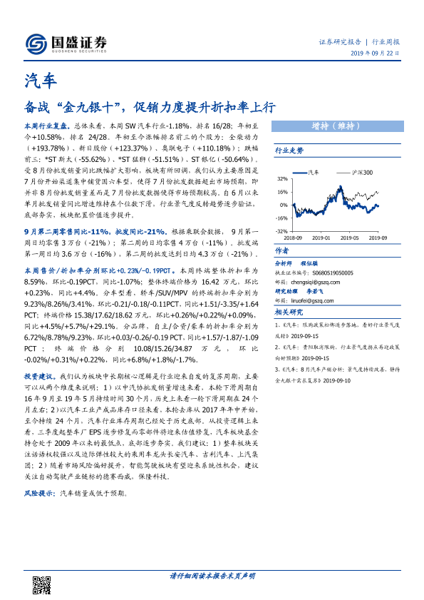 【国盛证券】【20190922】汽车行业周报:备战“金九银十”,促销力度提升折扣率上行-14页