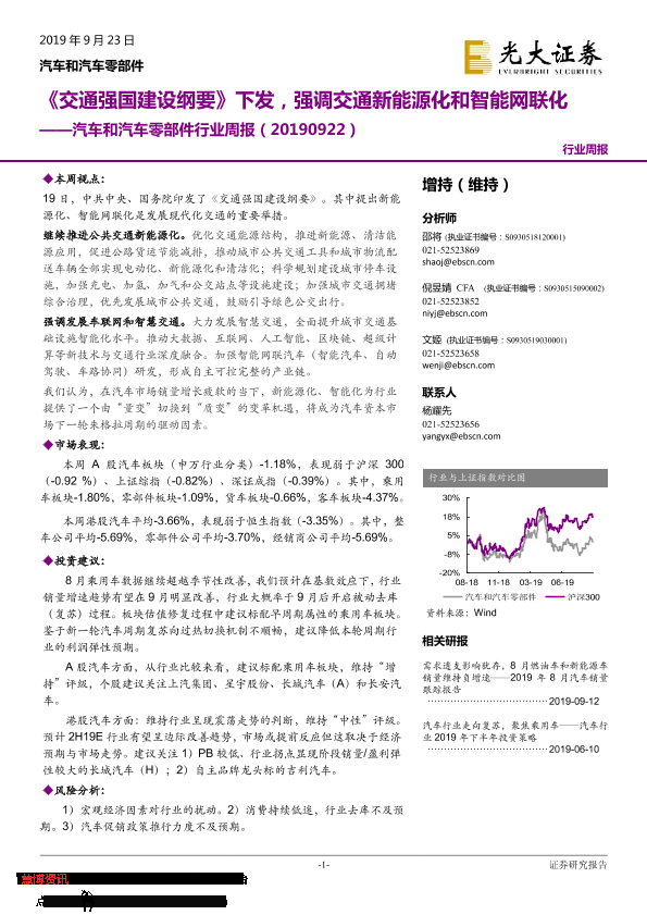 【光大证券】【20190923】汽车和汽车零部件行业周报:《交通强国建设纲要》下发,强调交通新能源化和智能网联化-12页