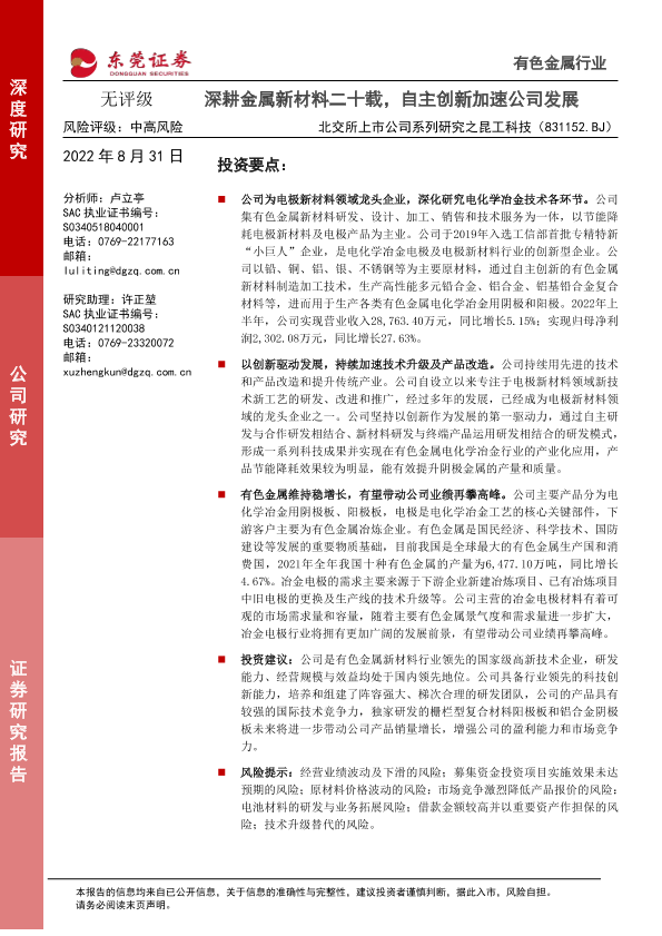 【东莞证券】【20220831】北交所上市公司系列研究之昆工科技:深耕金属新材料二十载,自主创新加速公司发展-22页