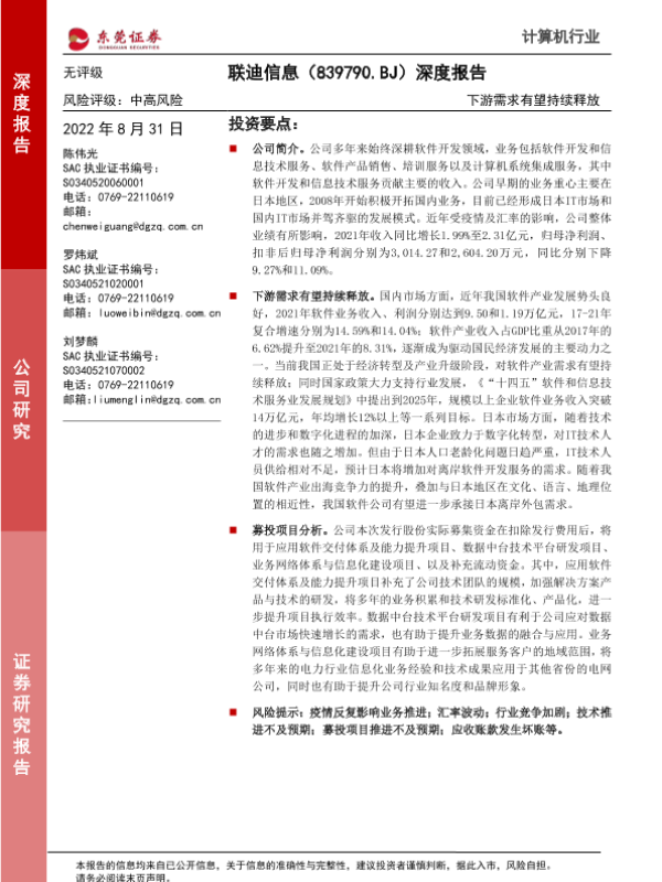 下游需求 信息技术服务 募投项目 软件开发 风险提示