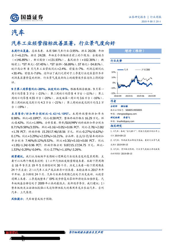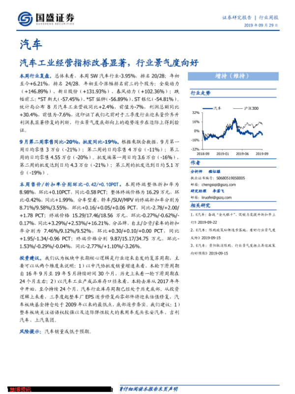 【国盛证券】【20190929】20190929-国盛证券-汽车行业周报:汽车工业经营指标改善显著,行业景气度向好-14页