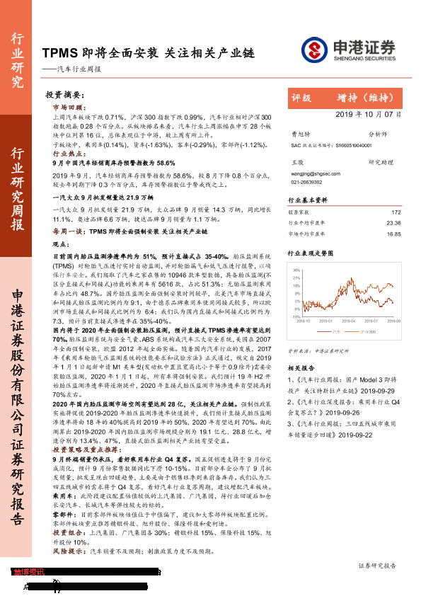 【申港证券】【20191007】20191007-申港证券-汽车行业周报:TPMS即将全面安装 关注相关产业链-20页