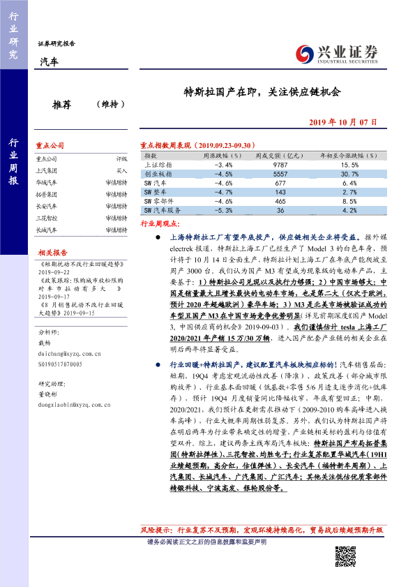 【兴业证券】【20191007】20191007-兴业证券-汽车行业周报:特斯拉国产在即,关注供应链机会-14页