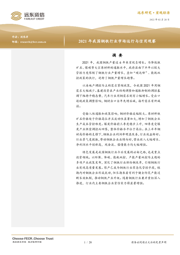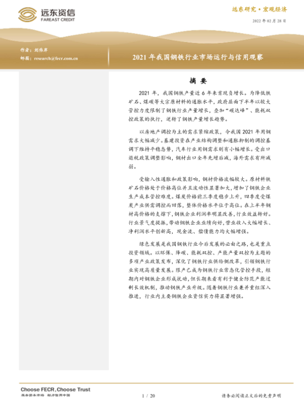 【远东资信】【20220228】2021年我国钢铁行业市场运行与信用观察-20页
