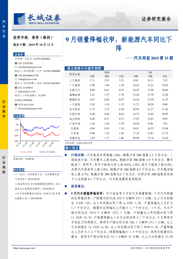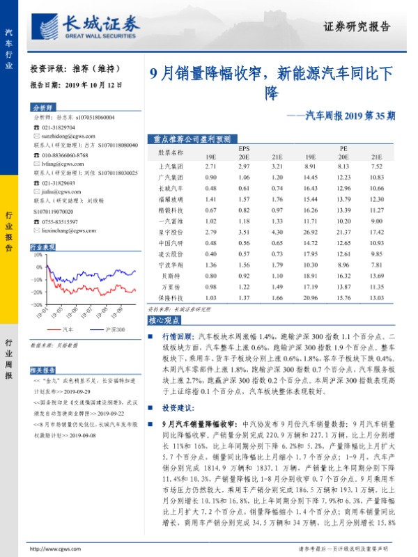 【长城证券】【20191012】汽车周报2019第35期:9月销量降幅收窄,新能源汽车同比下降-14页