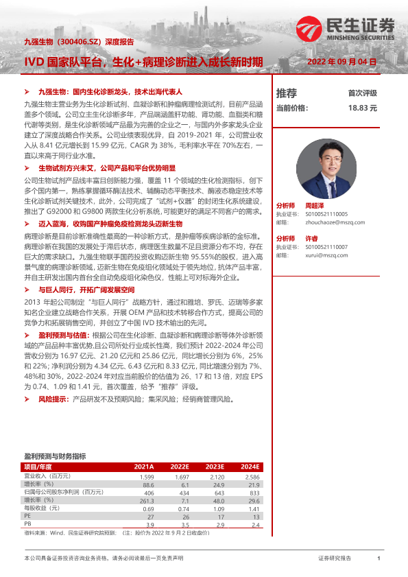 【民生证券】【20220904】九强生物(300406.SZ)深度报告:IVD国家队平台,生化+病理诊断进入成长新时期-26页