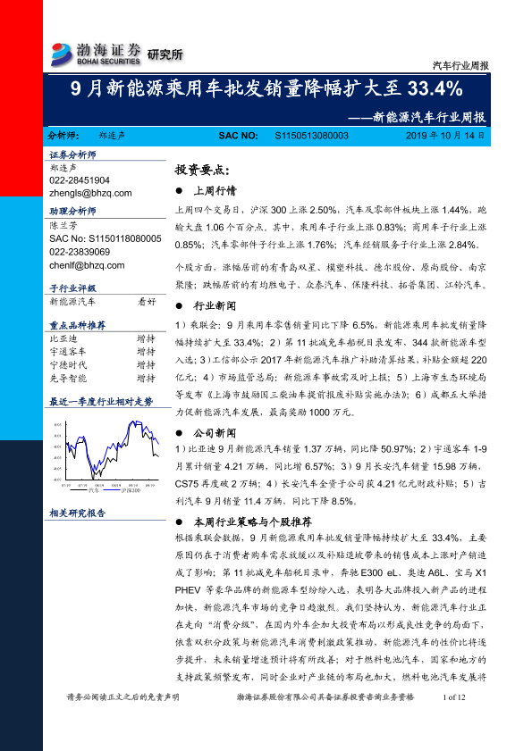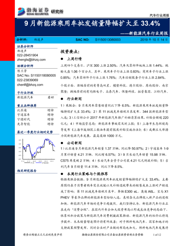 【渤海证券】【20191014】20191014-渤海证券-新能源汽车行业周报:9月新能源乘用车批发销量降幅扩大至33.4%-12页