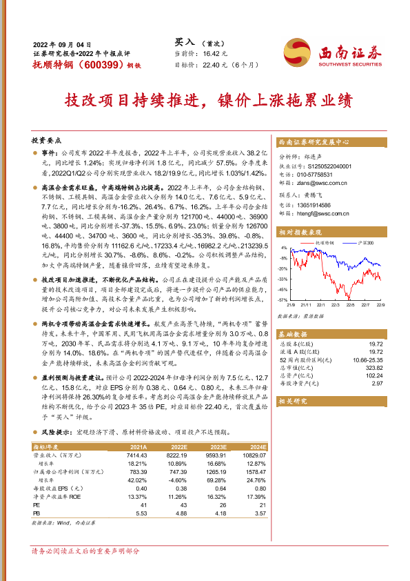 【西南证券】【20220904】抚顺特钢-技改项目持续推进,镍价上涨拖累业绩-16页