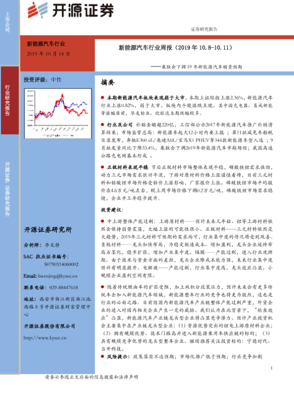 【开源证券】【20191014】20191014-开源证券-新能源汽车行业周报:乘联会下调19年新能源汽车销量预期-11页