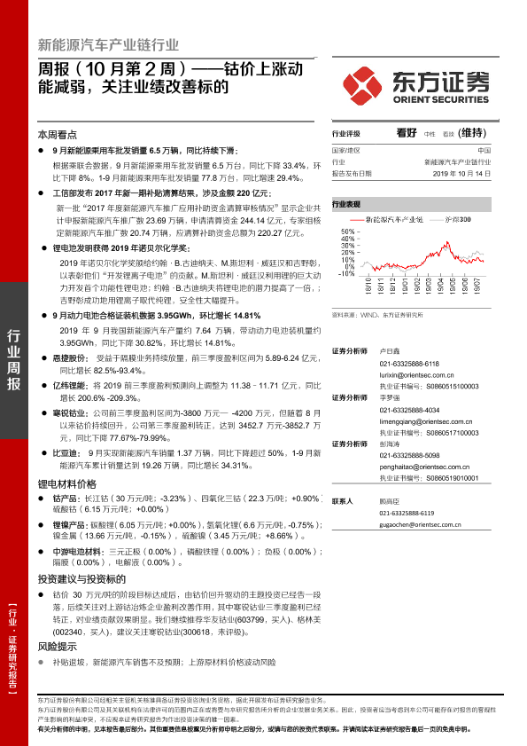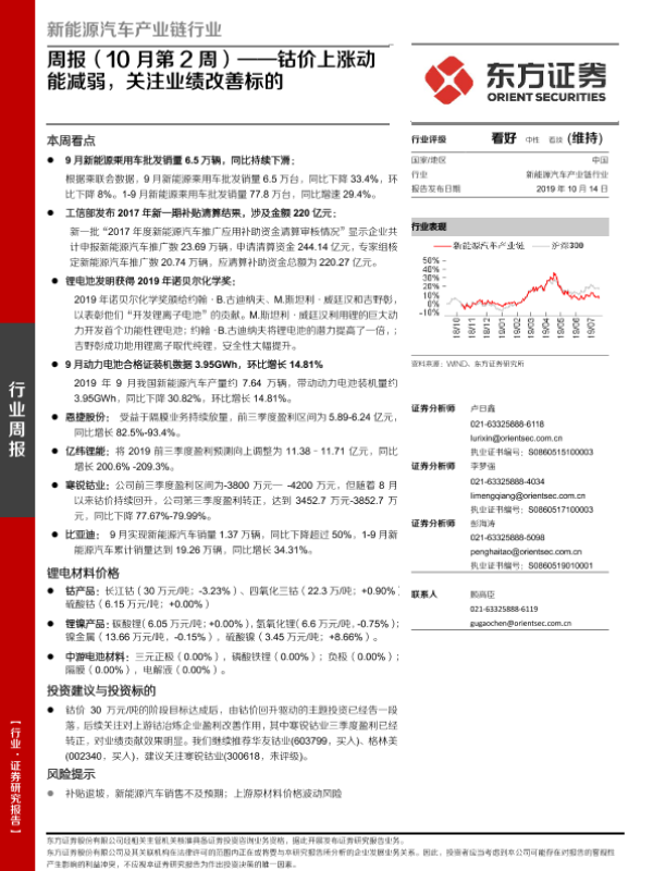 【东方证券】【20191014】20191014-东方证券-新能源汽车产业链行业周报(10月第2周):钴价上涨动能减弱,关注业绩改善标的-23页