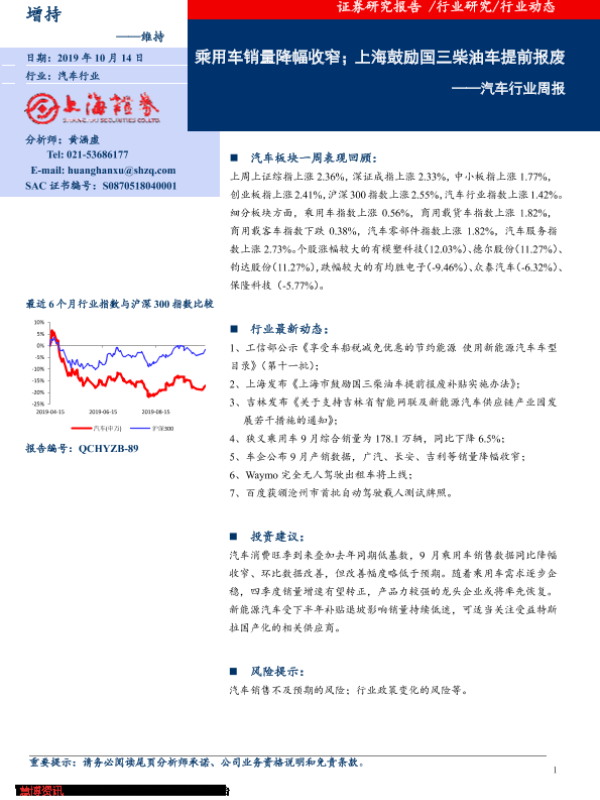 【上海证券】【20191014】20191014-上海证券-汽车行业周报:乘用车销量降幅收窄;上海鼓励国三柴油车提前报废-9页