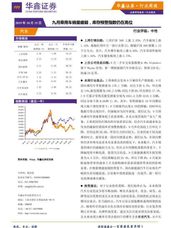 【华鑫证券】【20191015】20191015-华鑫证券-汽车行业周报:九月乘用车销量疲弱,库存预警指数仍在高位-19页