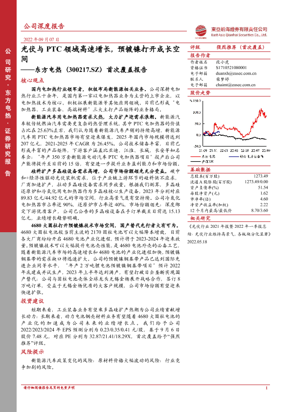 【东亚前海证券】【20220907】20220907-东亚前海证券-东方电热-300217.SZ-首次覆盖报告:光伏与PTC领域高速增长,预镀镍打开成长空间-33页