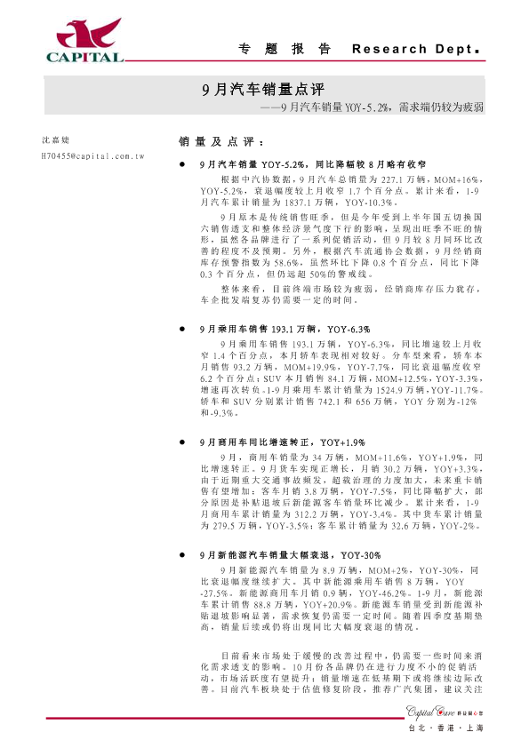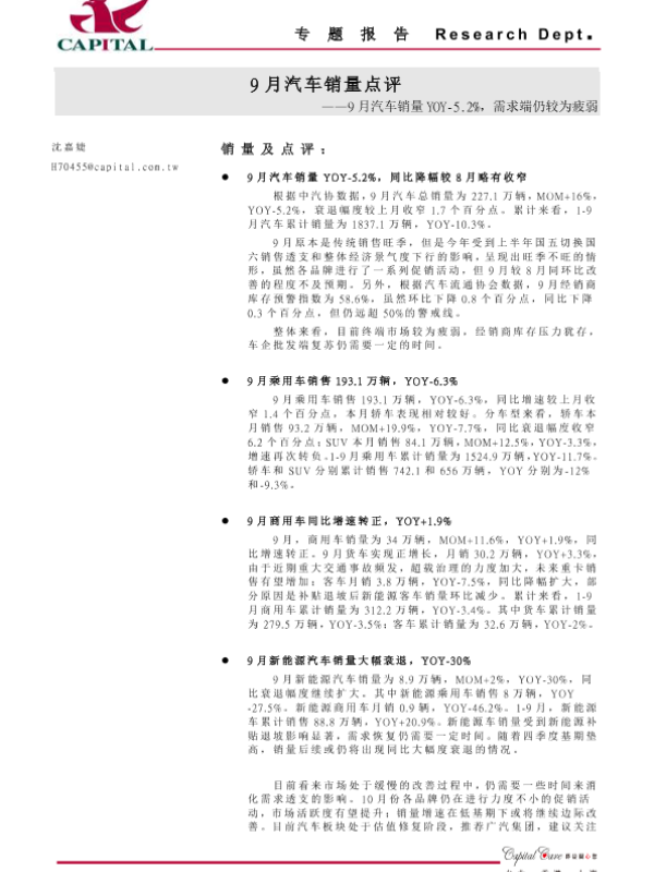 【群益证券】【20191018】9月汽车销量点评:9月汽车销量YOY-5.2%,需求端仍较为疲弱-3页