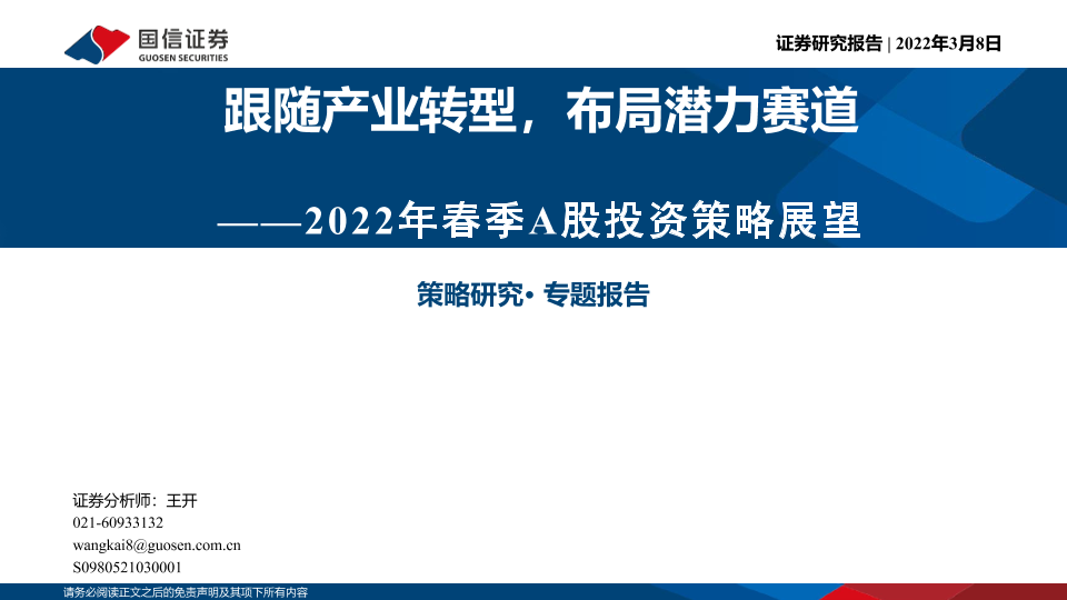 【国信证券】【20220308】2022年春季A股投资策略展望:跟随产业转型,布局潜力赛道-33页