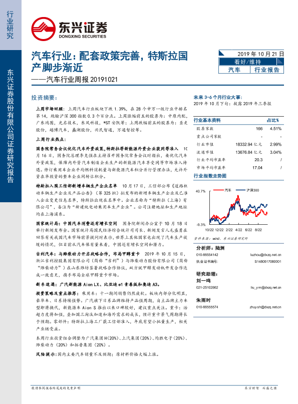 【东兴证券】【20191021】20191021-东兴证券-汽车行业周报:配套政策完善,特斯拉国产脚步渐近-15页