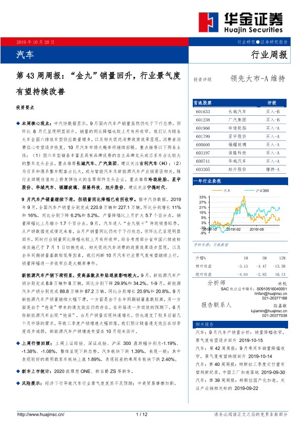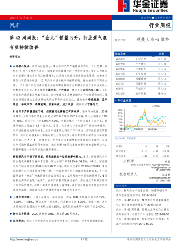 【华金证券】【20191020】汽车第43周周报:“金九”销量回升,行业景气度有望持续改善-12页