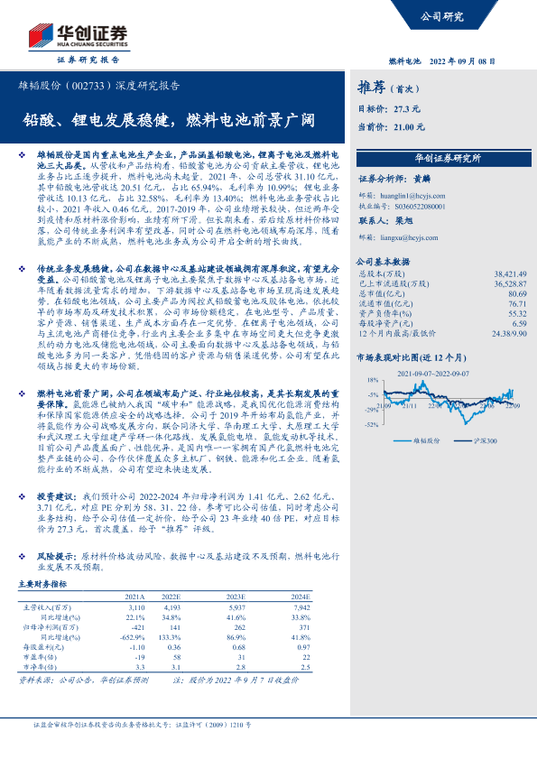 【华创证券】【20220908】20220908-华创证券-雄韬股份-002733.SZ-深度研究报告:铅酸、锂电发展稳健,燃料电池前景广阔-28页