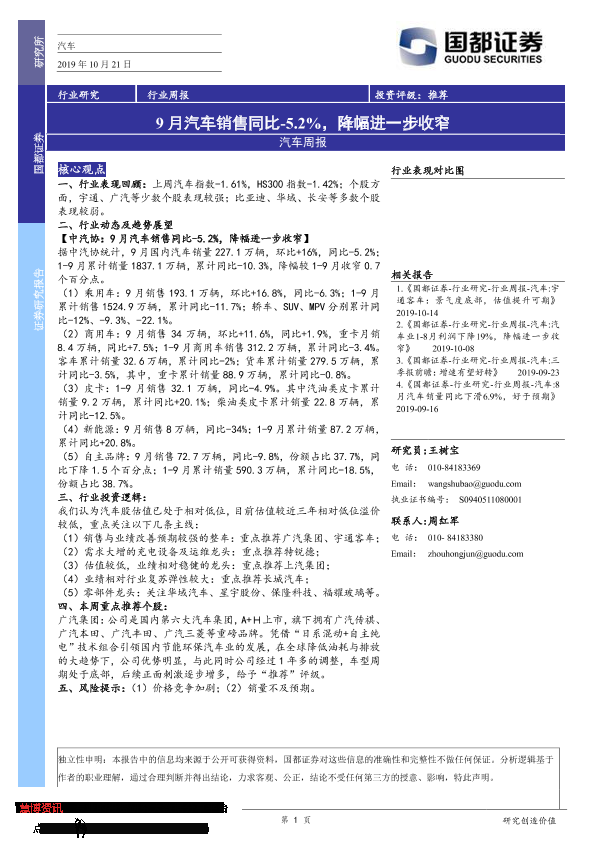 【国都证券】【20191021】20191021-国都证券-汽车周报:9月汽车销售同比-5.2%,降幅进一步收窄-2页