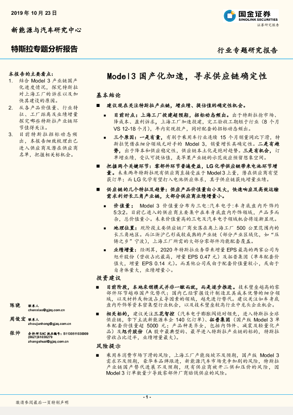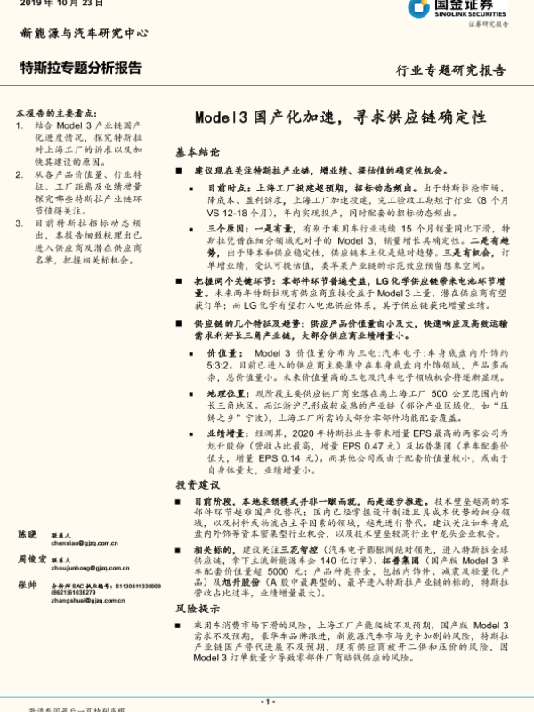 【国金证券】【20191023】20191023-国金证券-特斯拉专题分析报告:Model3国产化加速,寻求供应链确定性-22页