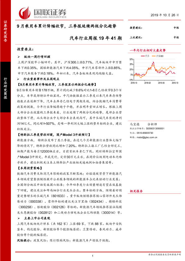 【国联证券】【20191026】20191026-国联证券-汽车行业周报19年41期:9月乘用车累计降幅收窄,三季报延续两极分化趋势-19页
