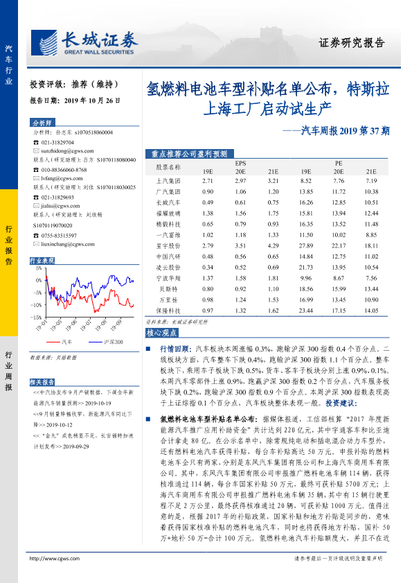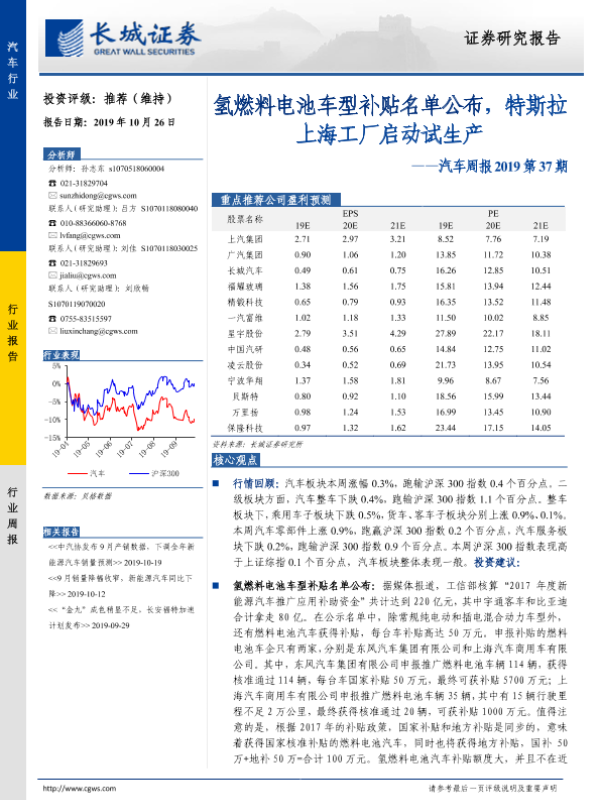 【长城证券】【20191026】汽车周报2019第37期:氢燃料电池车型补贴名单公布,特斯拉上海工厂启动试生产-18页
