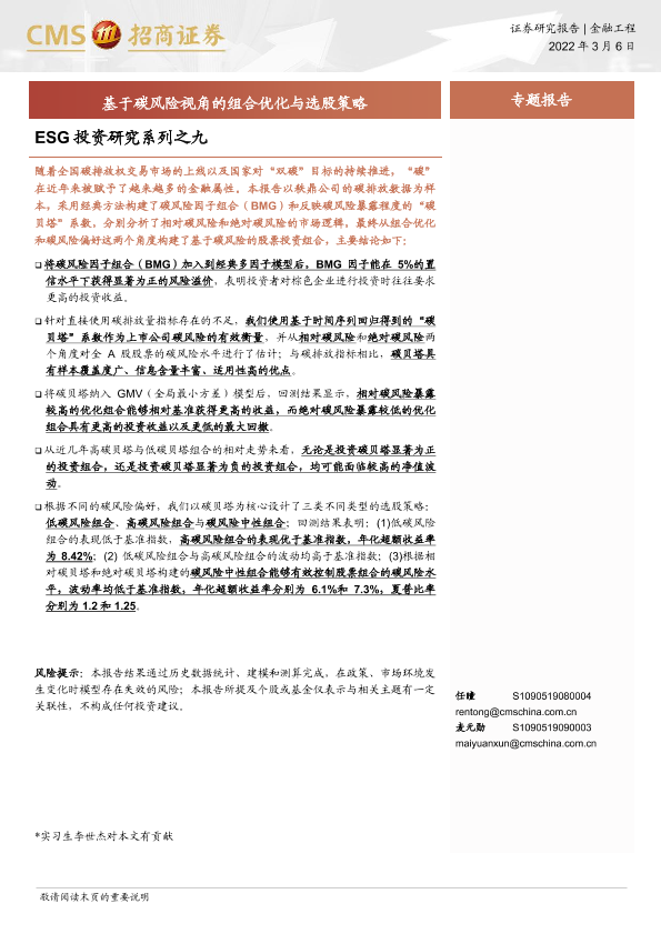 【海通证券】【20220306】ESG投资研究系列之九:基于碳风险视角的组合优化与选股策略-22页