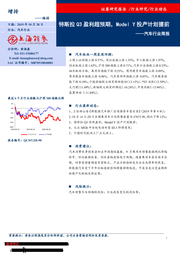 【上海证券】【20191028】20191028-上海证券-汽车行业周报:特斯拉Q3盈利超预期,Model Y投产计划提前-8页