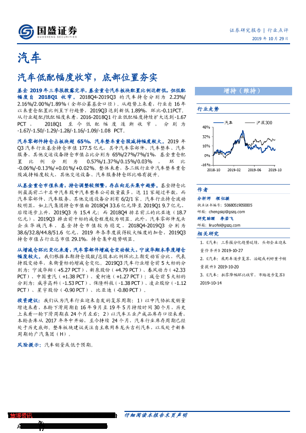 低配幅度 基金持仓 复苏周期 投资建议 汽车行业