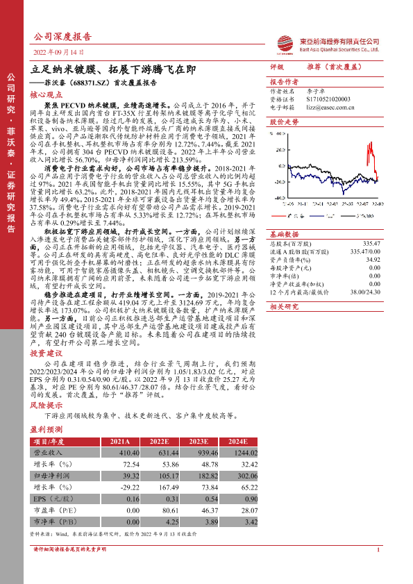 【东亚前海证券】【20220914】立足纳米镀膜、拓展下游腾飞在即——菲沃泰(688371.SH)首次覆盖报告-28页