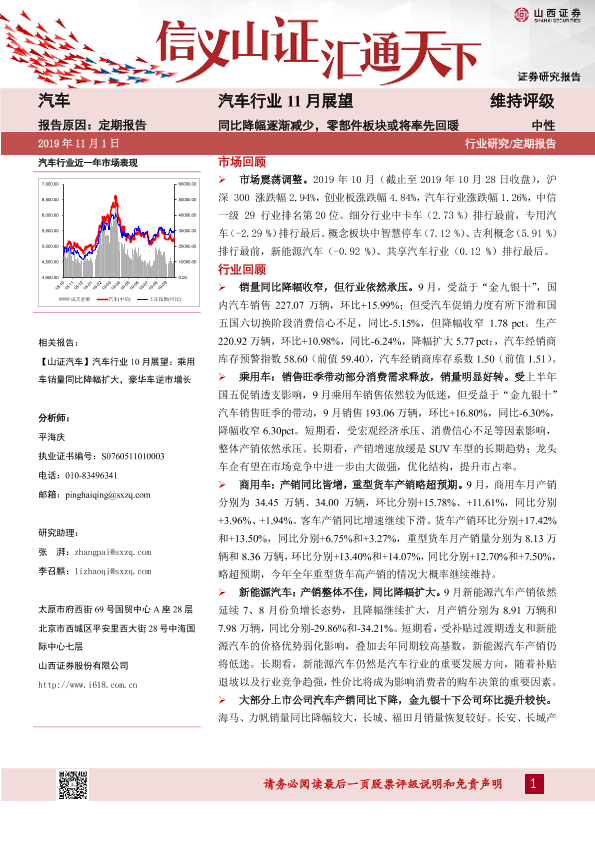 【山西证券】【20191101】20191101-山西证券-汽车行业11月展望:同比降幅逐渐减少,零部件板块或将率先回暖-28页
