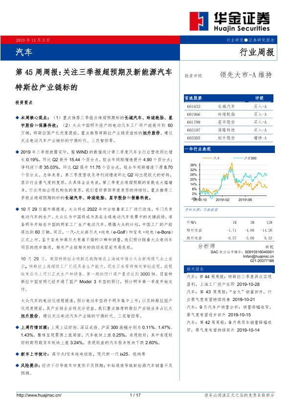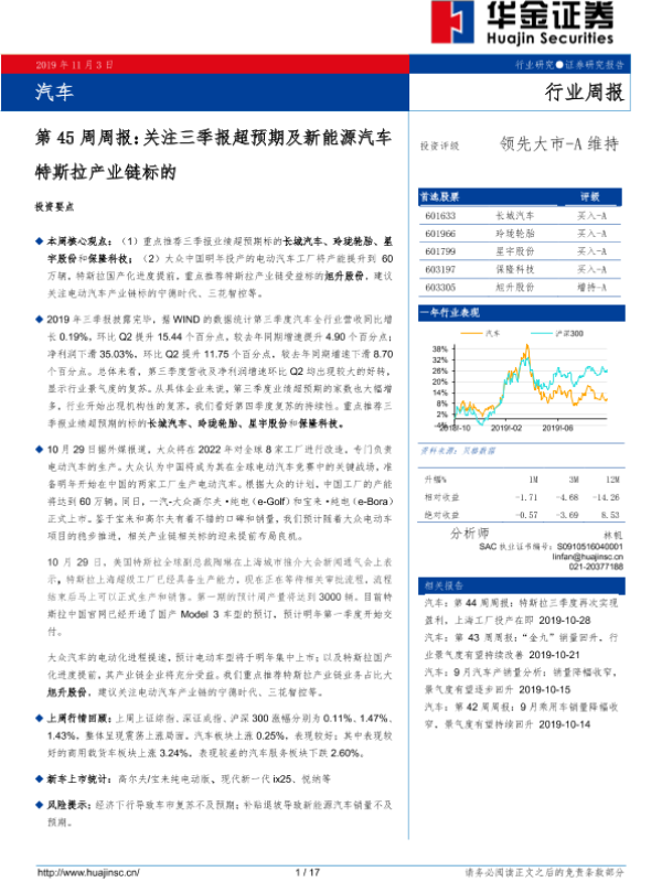 【华金证券】【20191103】汽车第45周周报:关注三季报超预期及新能源汽车特斯拉产业链标的-17页