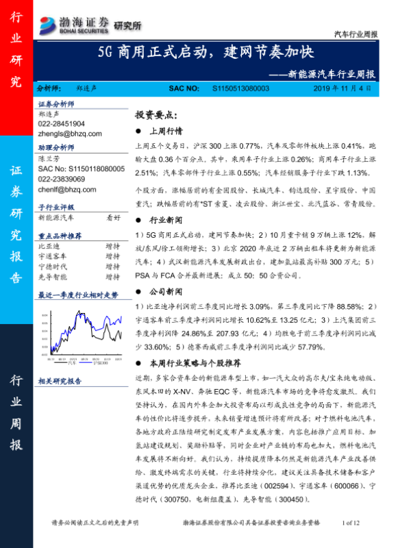 【渤海证券】【20191104】20191104-渤海证券-新能源汽车行业周报:5G商用正式启动,建网节奏加快-12页