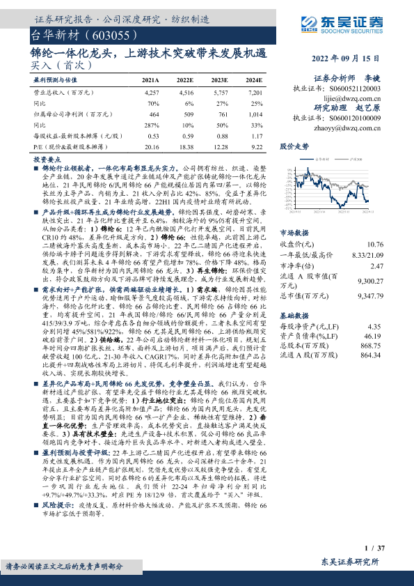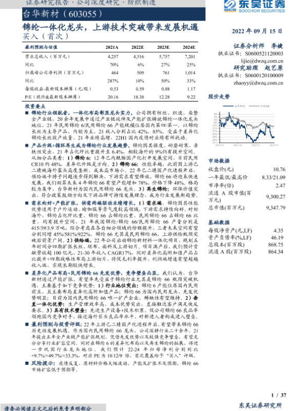 【东吴证券】【20220915】台华新材-603055.SH-锦纶一体化龙头,上游技术突破带来发展机遇-37页