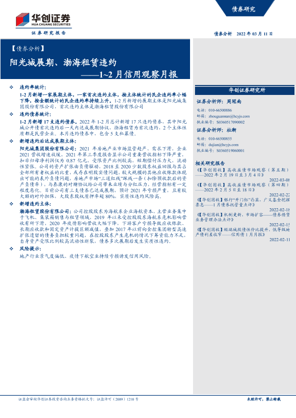 【华创证券】【20220311】【债券分析】1-2月信用观察月报:阳光城展期、渤海租赁违约-22页