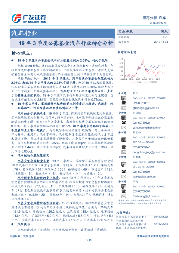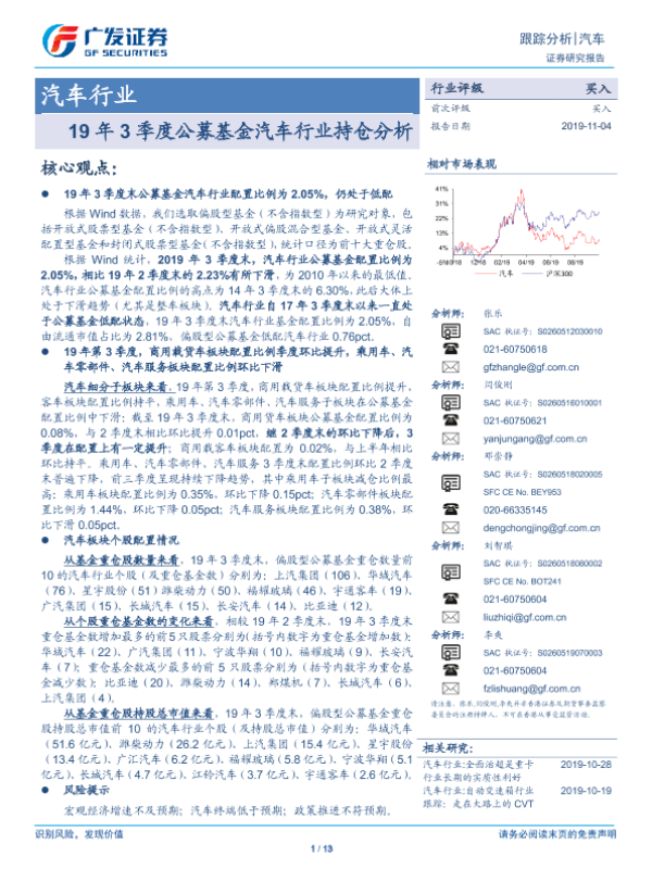 【广发证券】【20191104】19年3季度公募基金汽车行业持仓分析-13页