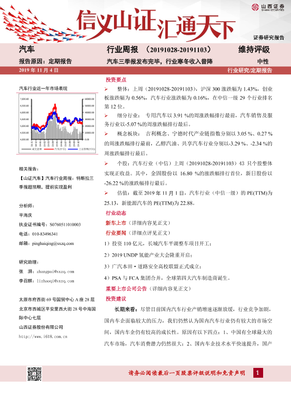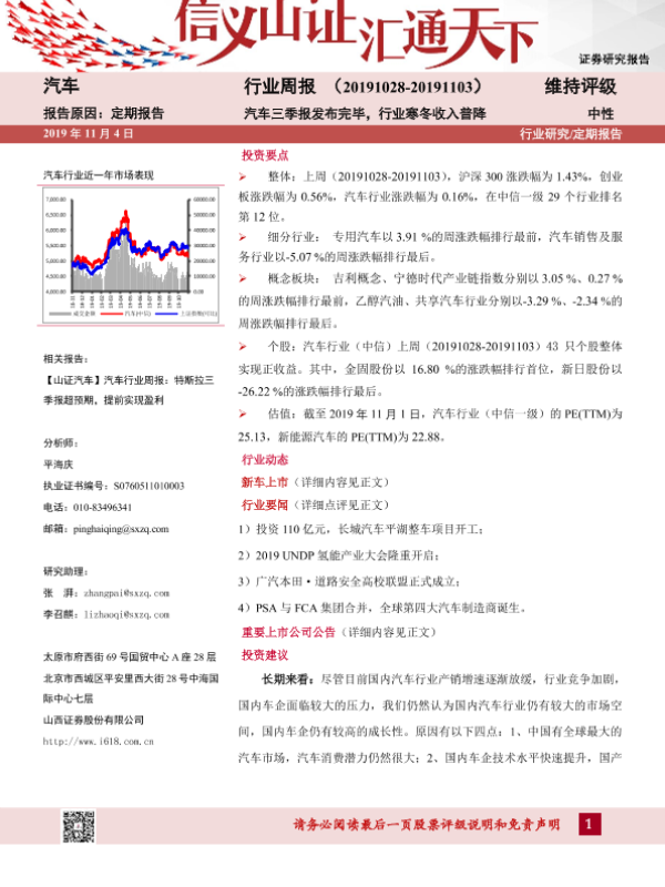 【山西证券】【20191104】20191104-山西证券-汽车行业周报:汽车三季报发布完毕,行业寒冬收入普降-16页